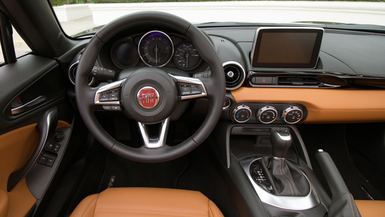 I was disappointed to discover that the interior went in for only the most minor of revamps. Mazda's Connect infotainment system carries over, as do the gauges (although the Abarth has a red applique surrounding the central tach). The Mazda wheel wears a Fiat badge and a different rim, and the seats use the structure from the Miata's with Fiat coverings and altered stuffing. This is admittedly a non-issue if you're unfamiliar with how Mazda's interior bits look, and it all works just as well as it does in the MX-5. I think the Lusso's tan leather seats, with handsome stitching, look great.